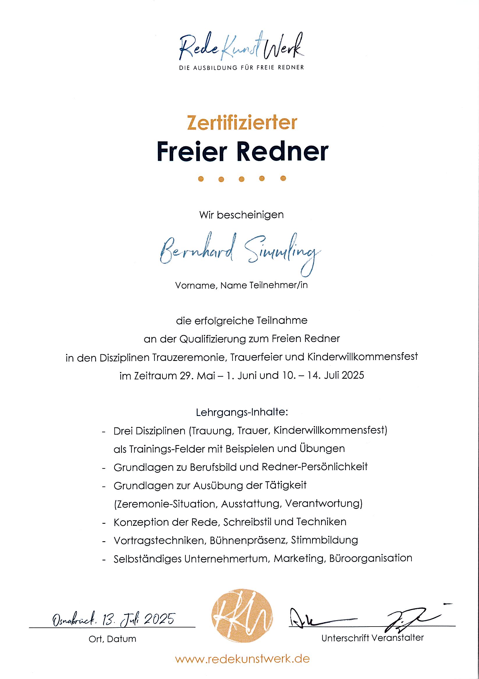 Mit jahrelanger Erfahrung im einfühlsamen Umgang mit Trauernden und einer fundierten Ausbildung bei der Industrie- und Handelskammer (IHK) versteht er es, individuelle Lebensgeschichten in ein würdiges sprachliches Gewand zu kleiden.